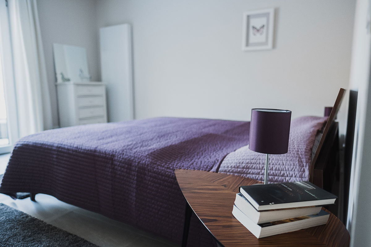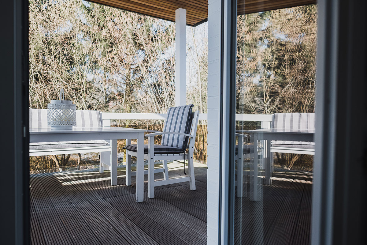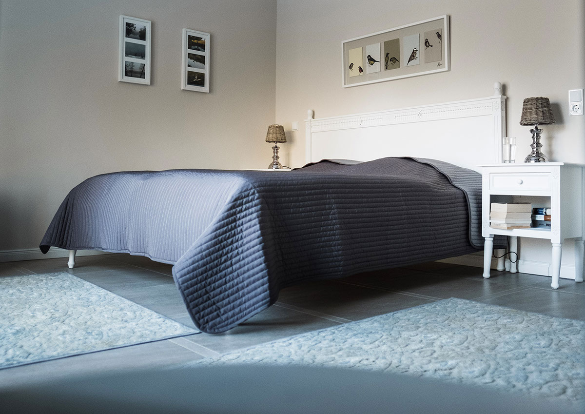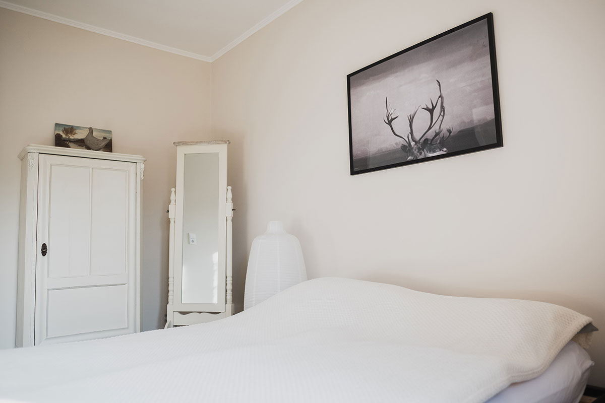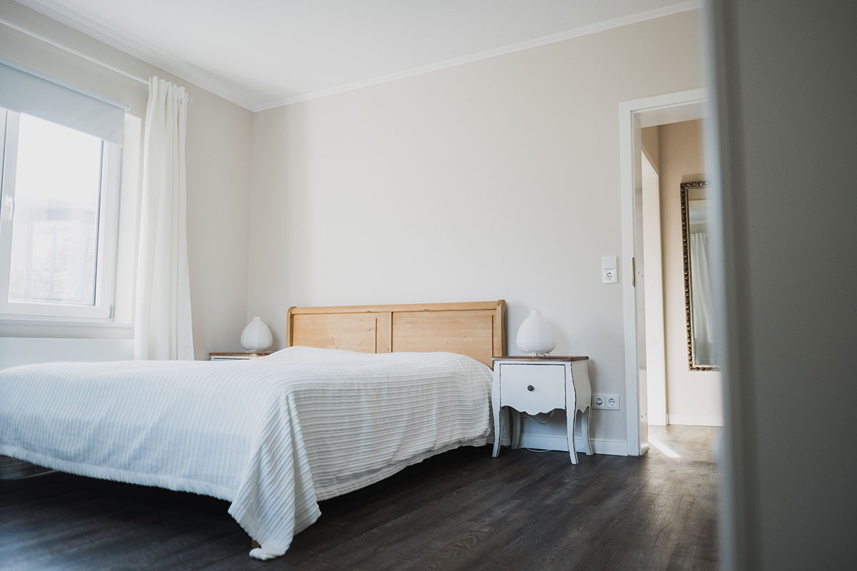 Eines der oberen Schlafzimmer hat Seeblick und ein Doppelbett in der Größe von 180 x 200 cm. Das andere Zimmer befindet sich auf der ruhigen, vorderen Seite des Hauses und hat ein Futonbett in der Größe von 140 x 200 cm.