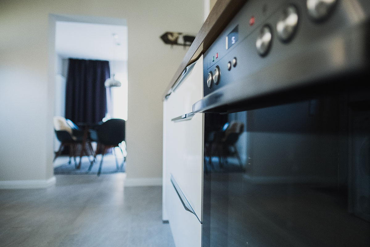Flur, Küche mit Geschirrspülmaschine, Elektroherd, Kühlschrank mit Gefrierteil, Waschmaschine, Wäschetrockner, Esszimmer, Bad und zwei Schlafzimmer.