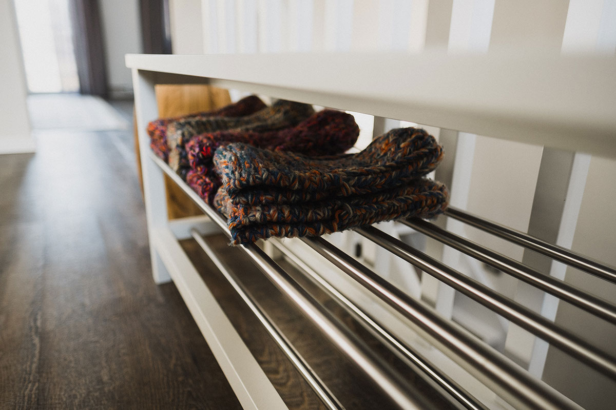 Das untere Duschbad ist modern gestaltet mit schwellenlosem Zugang in die Duschecke, rutschfesten Fliesen, einem Waschplatz, WC, Handtüchern und Fußbodenheizung.