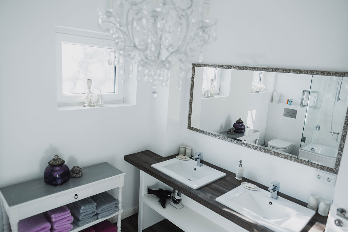 Flur, Wohnzimmer und Essbereich mit TV, Küche mit Induktionsherd, Kühlschrank mit Gefrierteil und Eisbereiter, Geschirrspülmaschine, zwei Doppelbettzimmer und Badezimmer (Badewanne mit Duschvorrichtung, WC, zwei Waschplätze, Fön, Handtücher etc.)